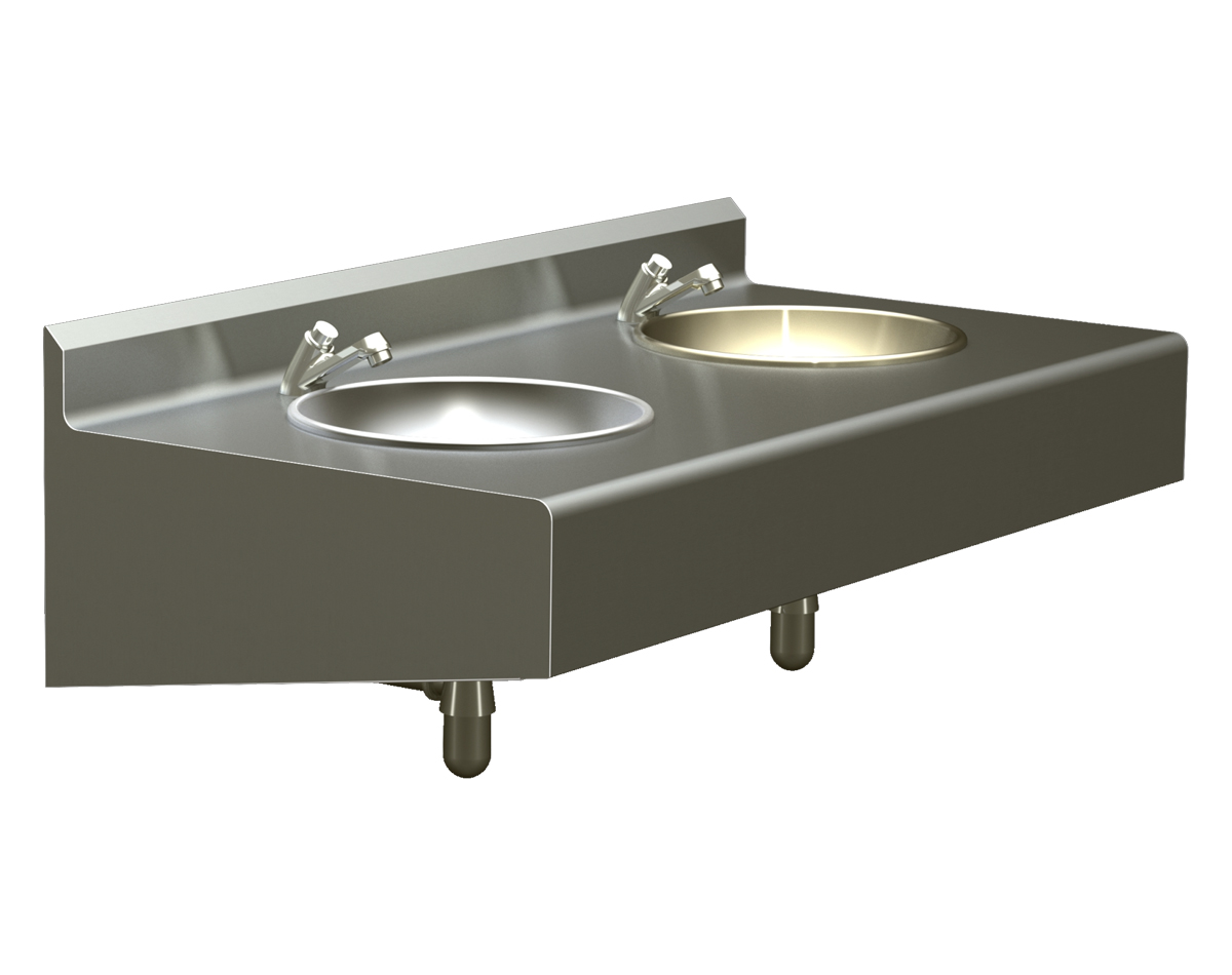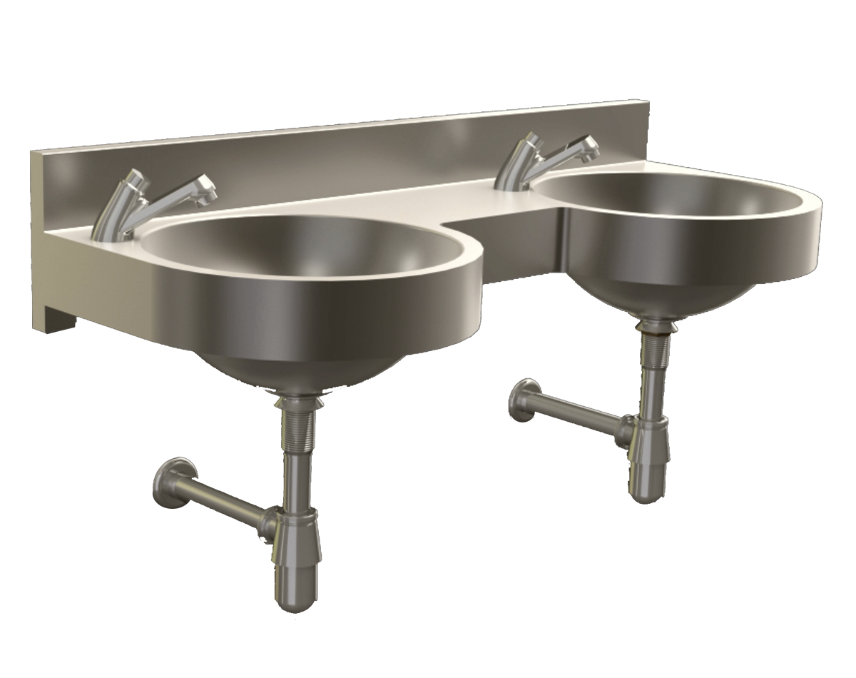 Fregadero de Doble Estación de Acero Inoxidable, con Llaves de Latón Cromado para Lavado de Manos, Activadas por Sensor, 24 VCA, con las siguientes características: